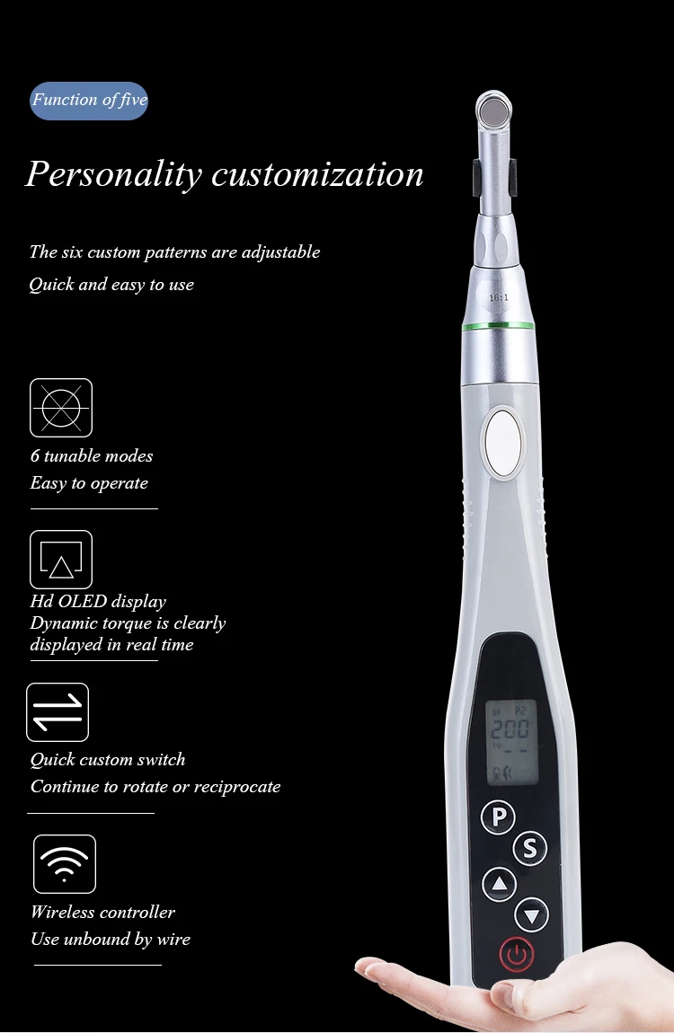 When operating, using mini push button 20:1(left and right reciprocating) dental contra-anglehandpiece to coordinate the machine files(hand files)