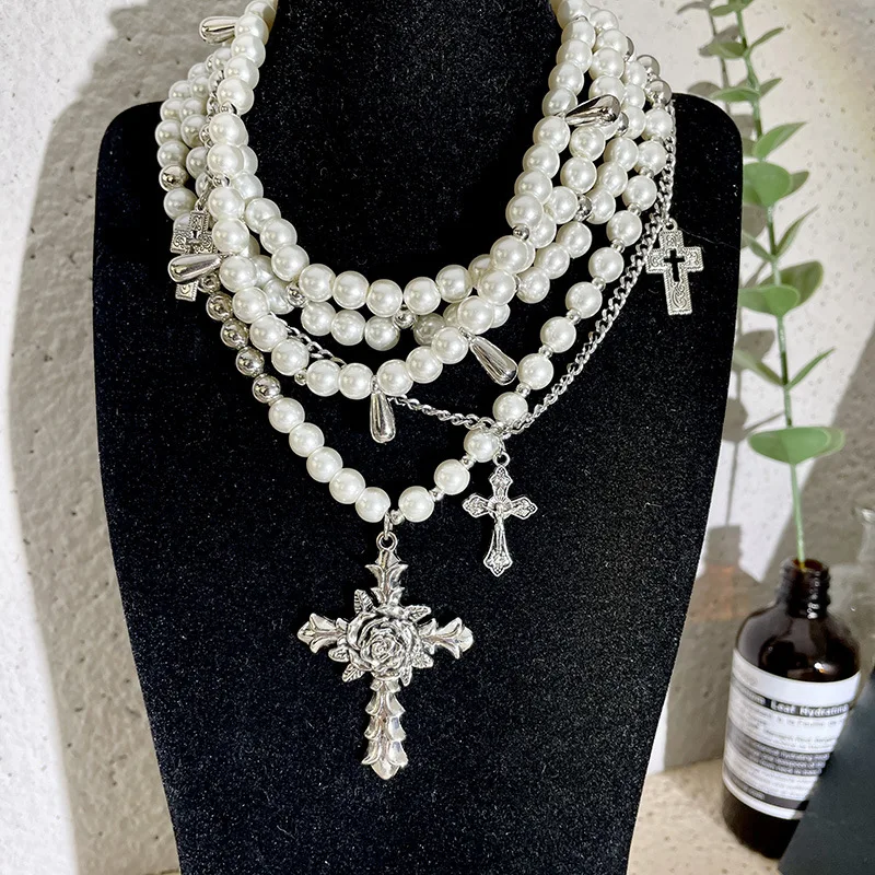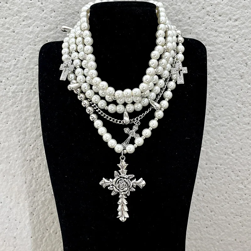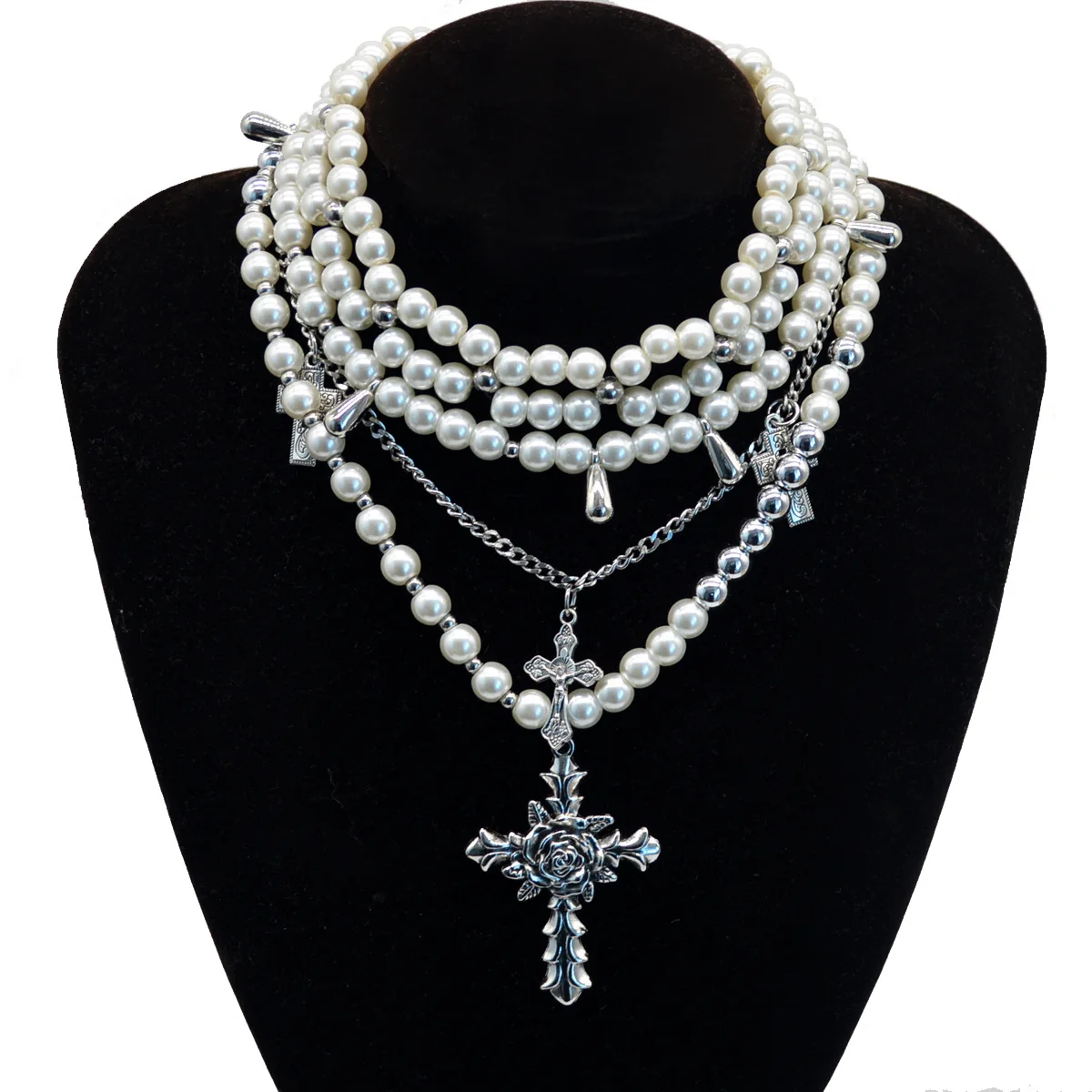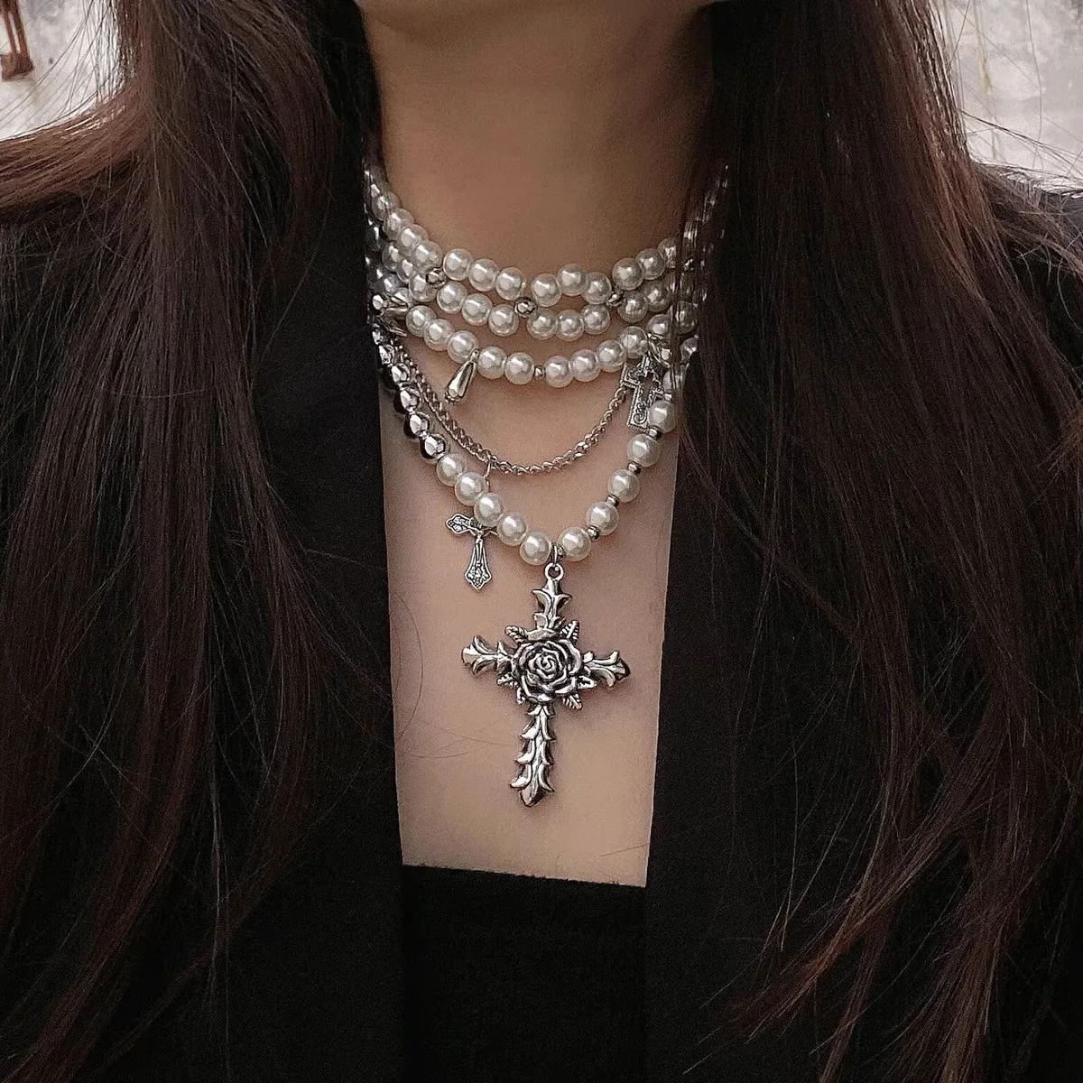 Goth Rose Flower Imitation Pearl Bead Cross Pendant Necklace for Women Multilayer Pearl Chains Aesthetic Vintage Luxury Jewelry
