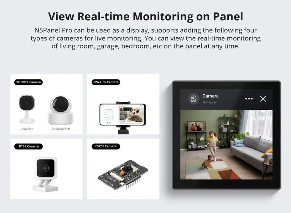 Camera ViewerNSPanel Pro can be used as a display and supports adding the following four types of cameras for live monitoring. You can view the real-time monitoring of the living room, garage,