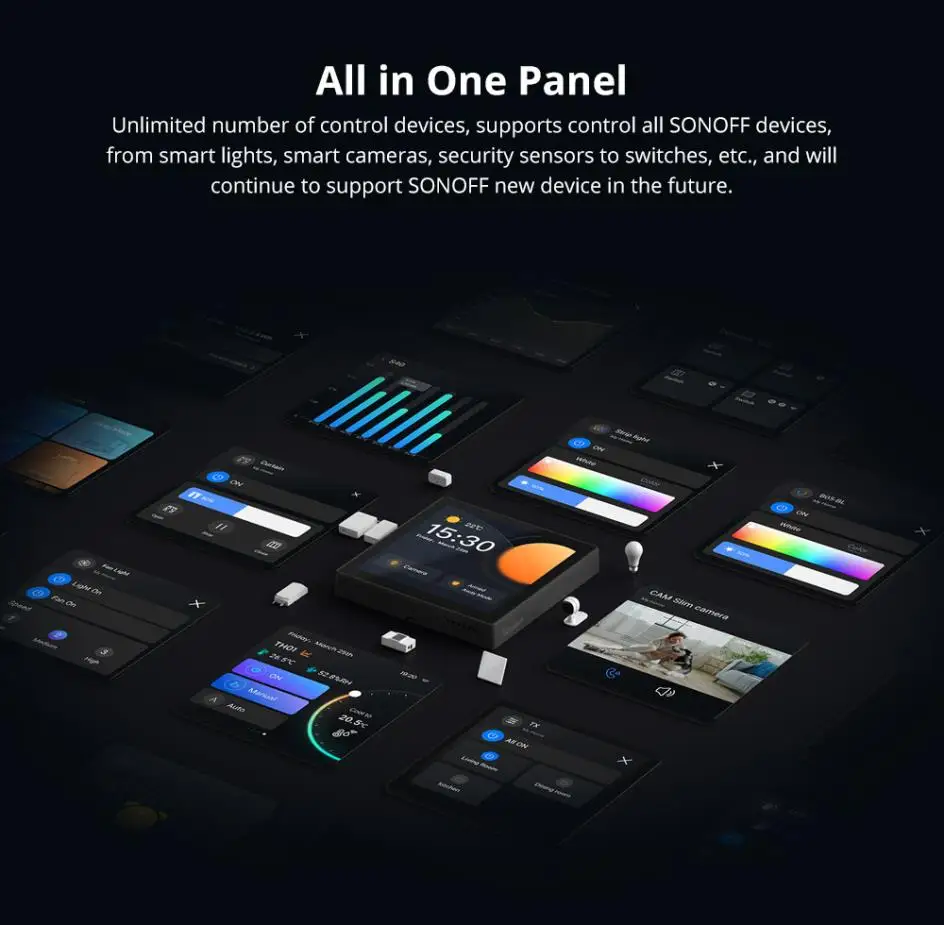 All in One Panel ControlUnlimited number of control devices, supports control all SONOFF devices, from smart lights, smart cameras, and security sensors to switches, etc., and will continue to