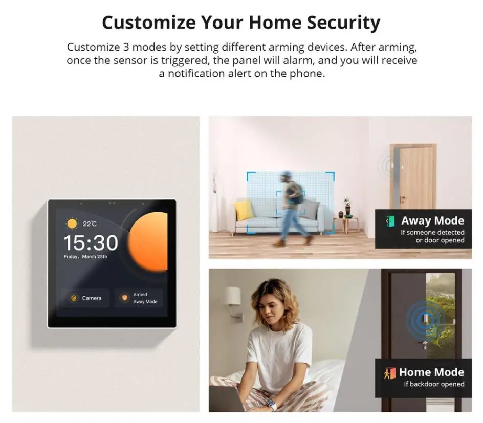Home SecurityCustomize 3 modes by setting different arming devices. After arming, once the sensor is triggered, the panel will alarm, and you will receive a notification alert on the phone.