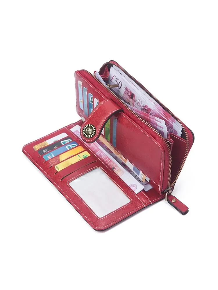 Color: Yellow - New Retro Long Purse Vintage Solid Color Oil Wax Hollowed Out Wallet Multifunction F640-12000038817288977