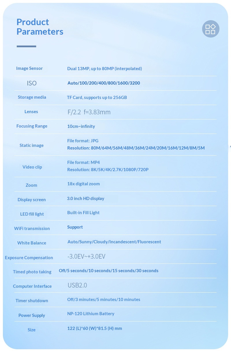 Package Contents: Camera manual, battery, data cable, packaging, cleaning cloth