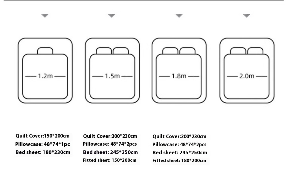 Applicable bed sizes: 1.2m three-piece set (duvet cover 150*200cm),1.5m four-piece set (duvet cover 200*230cm),1.8m four-piece set (duvet cover 200*230cm)