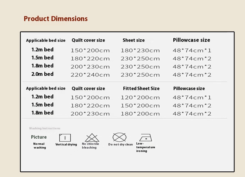 Size specification: 1.2m bed sheet three-piece quilt cover 150*200,1.5m bed sheet four-piece quilt cover 180*220,1.5m bed sheet four-piece quilt cover 200*230,1.8m bed sheet four-piece quilt cover 200*230,2.0 m bed sheet four-piece quilt cover 220*240,1.5m fitted bed sheet four-piece quilt cover 200*230,1.8m fitted bed sheet four-piece quilt cover 200*230