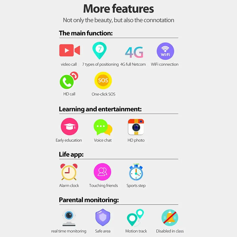 [Features]: flip function, dual front and rear cameras, one-click video call, WiFi connection, Alipay coin purse, GPS positioning, touch friends, learn speaking, listen to music, step counting, weather forecast, voice intercom, SOS emergency call and many more